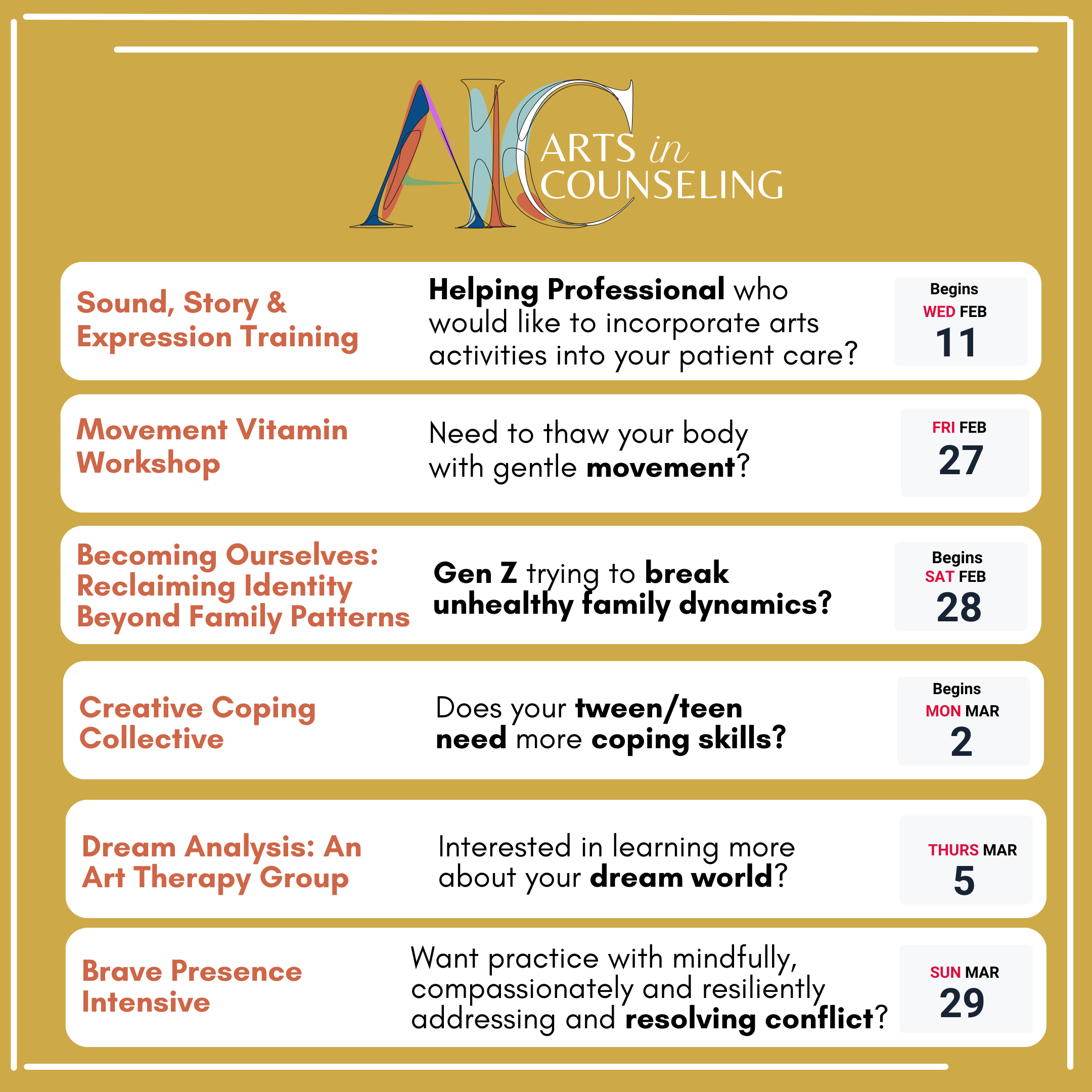 For mental health treatment: Individual, couples, family and group psychotherapy for all ages via somatic dance/movement therapy, art therapy, music therapy and expressive arts therapy